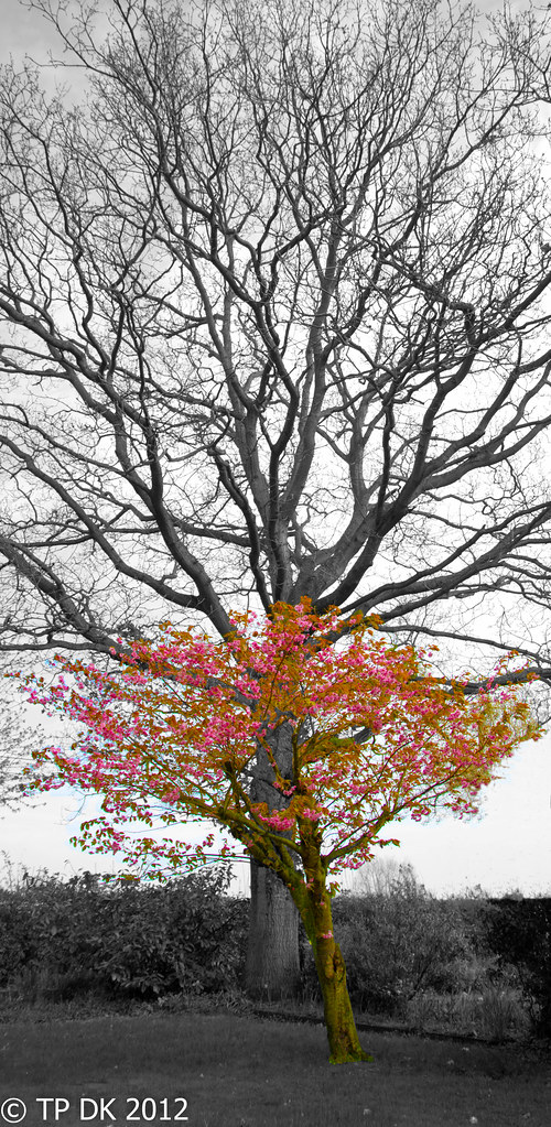 It looks like you may have had a half decent sky with some blue in it & some nice clouds , the bigger tree appears to bare of leaves so maybe , just maybe , this would have worked in color ? Maybe a little desaturation on the bigger tree just to make the smaller one stand out even more , as the flowers show off quite nicely that the front tree is indeed Short.....hope this makes sense ?