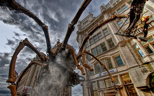 Just a few random shots over peoples heads from a balcony on the Strand. Very random shots with a DSLR trying to judge the correct angle. I decided to go and wait on street for La Princesse (the spider) to pass, but couldn't even get on the street at the junction. So I held back a bit to get the somewhat surreal image of a giant spider walking past the end of the road dwarfing all the people below it. It was very Sci Fi.