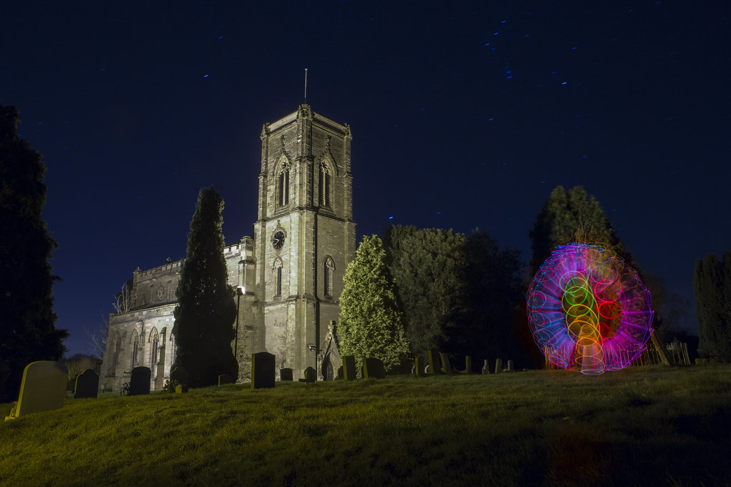 Introducing a new light painting trick for me, not new to the world of light painting as these have been done for a while now, but this is the first time I've captured one, here you see the ball of colour coming together in my local church, and under a star filled sky